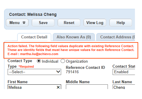 • When users add or update a reference contact that has duplicate identifier field value with an existing reference contact, an error message displays indicating the conflict.