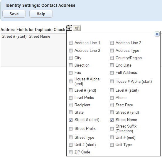 1. Click the field selector next to the Address Fields for Duplicate Check label.