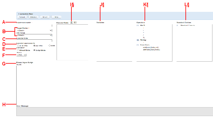 G Expression Area. If you select Script Mode, write the customized EMSE scripts for the desired expression in the script entry area. If you select Wizard Mode, enter the expression criteria and the values, as the wizard guides you through the process. S