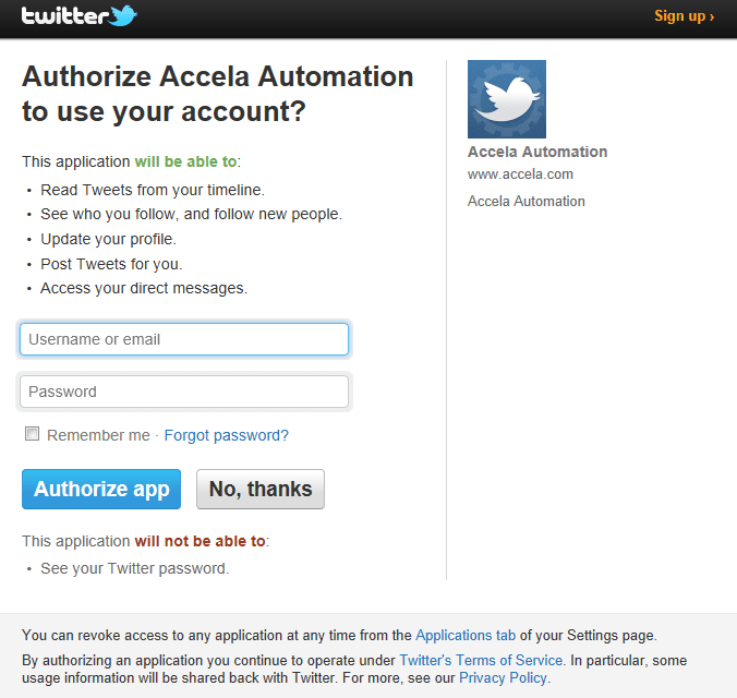 4. Enter your Twitter account credentials, and then click Authorize app.