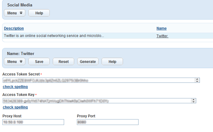 6. Return to the Social Media administration portlet, and enter the Twitter connection details.