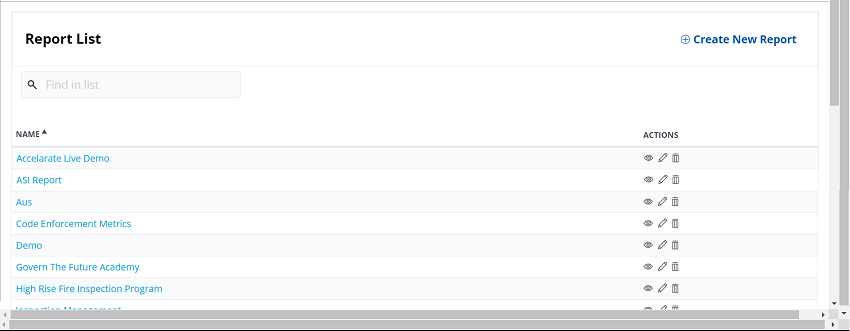 1. From the Accela Insights Reports List, locate the report you want to delete and click the trashcan icon under Actions.