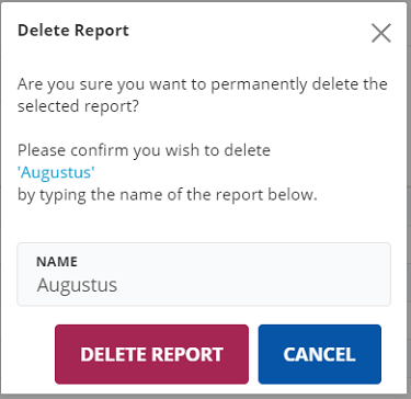 The Delete Report confirmation pop up appears to prevent accidental deletion of important reports.