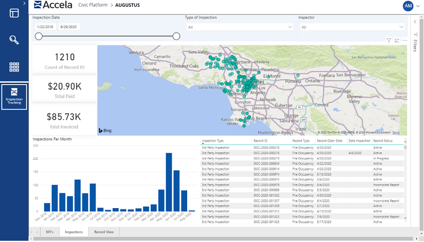The Accela Insights Reporting Service is a data visualization tool powered by Microsoft Power BI that you can use to create modern, interactive dashboards within the Civic Platform. Its intuitive, drag-and-drop interface lets you create everything from simple data visualizations and dashboards to sophisticated, interactive dashboards that display complex data in a coherent, visually immersive, and interactive manner. You can use its wide array of data visualizations—which includes maps, bar charts, graphs, and much more—to present complicated data in a way that's easy for users to understand and manipulate. You can deploy Accela Insights dashboards with the same Report Manager usability and features used for other Accela report services, organizing dashboards in reports folders or adding them directly to users' home screens where they'll see them each time they log in.