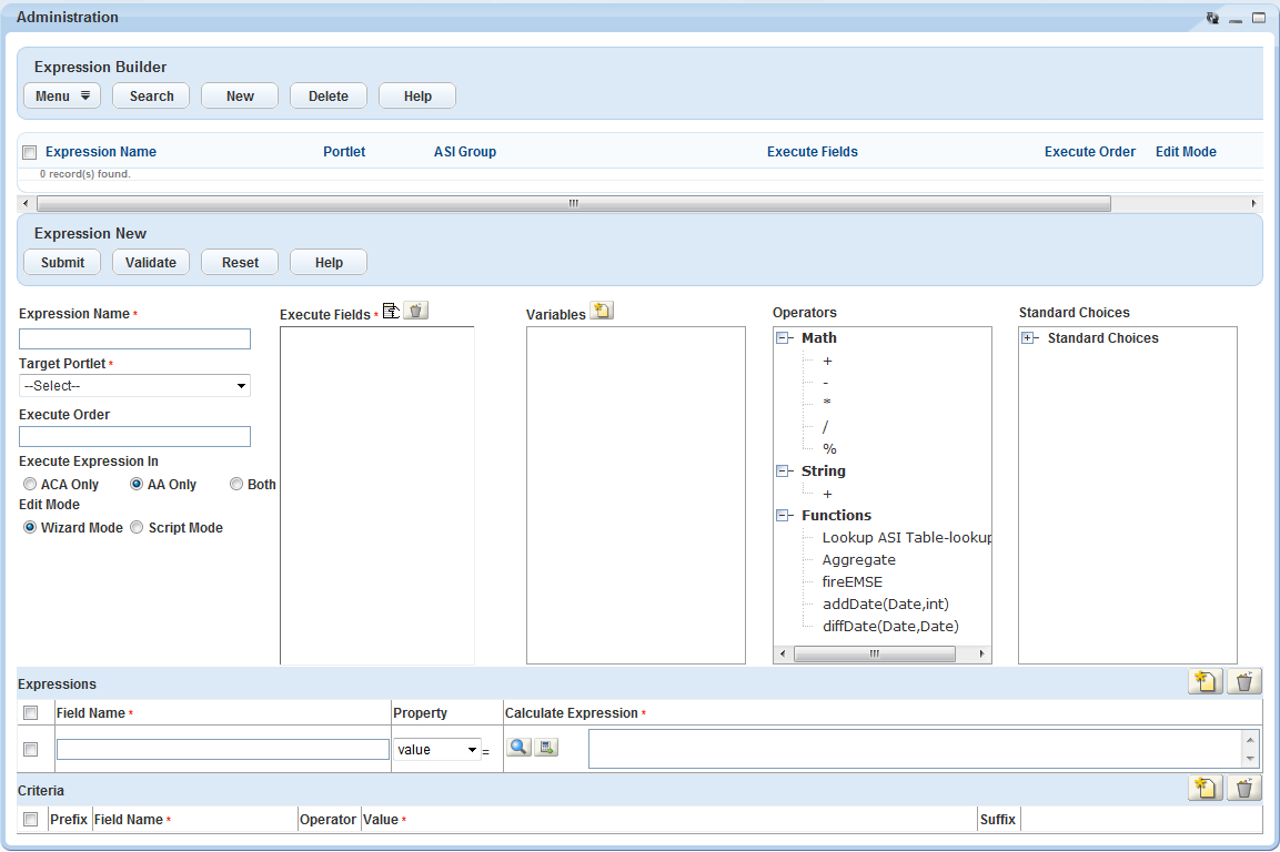 You can use the Expression Builder wizard to create expressions. You can also create expressions with the Event Manager and Scripting Engine (EMSE) scripting language. When you create expressions with the Expression Builder wizard, Civic Platform generates the EMSE script for that expression. You can use Expression Builder to edit an expression. You can also use EMSE to edit expressions directly in the scripting language. You can extend the functionality of expressions, beyond the functionality provided through the Expression Builder wizard, by enhancing the EMSE expression scripts (Customizing an Expression Script).