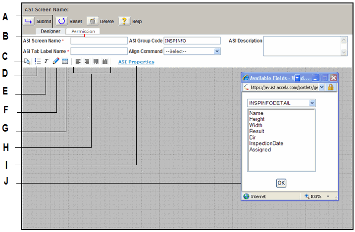 G Add ASI Table or Attribute button. This button is only available for ASI and Asset forms. Click the button to add the table associated with an ASI Group Code or an Asset Template ID to the form.