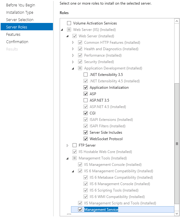 • Install Microsoft Internet Information Server (IIS) 7.x with the default roles and role services, or 8.x with all the roles and role services shown here.