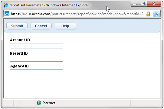 Enter the parameters for the report and click Submit. For information on using parameters, see Specifying Report Parameters.