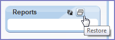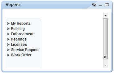 If your Civic Platform Home page is configured to display a Reports portlet, restore it if collapsed, then maximize it if desired (Maximize button replaces the Restore button).