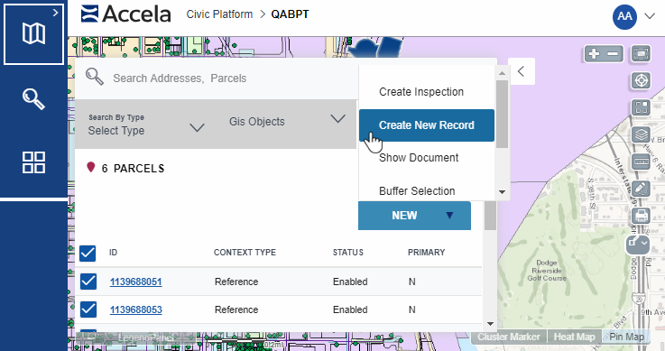 While working with map features, you can create records to be associated with your selected GIS objects. This allows you to visually confirm the geographic objects within your agency's jurisdiction that requires additional action, and also allows you to bind GIS information with transactional records in Civic Platform. These records can be a permit application, work order, service request, asset condition assessment, and other record types supported in Civic Platform.
