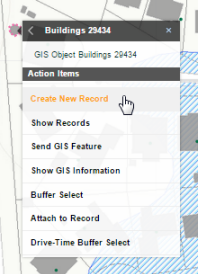 You can create a record for a single GIS feature, or create records for multiple selections. If you selected a single map feature, create a new record by choosing Create New Record from the context menu. For example: