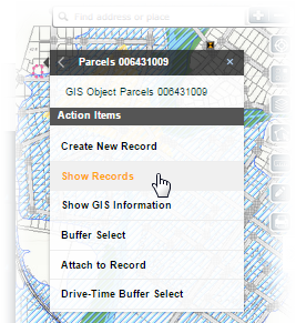 Using the Map dashboard in Civic Platform, you can see and analyze Civic Platform records within the context of their geographic locations. When you select one or more map locations, the Show Records option is available on the context menu and displays all records associated with the selected GIS feature, providing links to related transaction details.