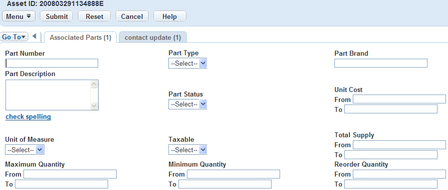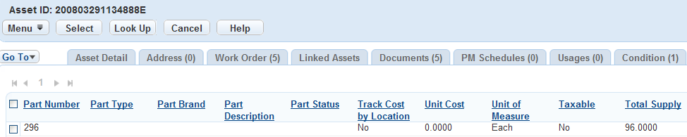 Managing an asset often involves managing the parts commonly used to repair and maintain the asset. Maintenance personnel need to quickly access part information in order to complete work orders. You can associate part records to asset records so that users can view part information such as type, number, brand, description, and quantity in the asset record. When parts are associated to an asset, these standard parts are loaded into work orders generated for that asset. Users can click a button in the work order form to view the parts associated to the asset and then select parts from this list for issuance to complete the work order.