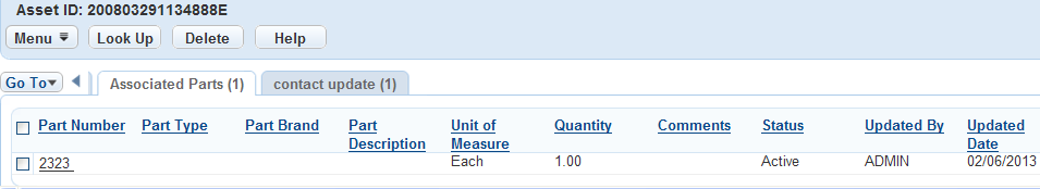 You may want to change the parts that are associated to an asset record. The manufacturer’s recommendations for parts may have changed, or you may have discovered a more cost-effective part to use. Deleting a part record from an asset record does not delete the part from the database; rather, it deletes the relationship between the part and the asset.